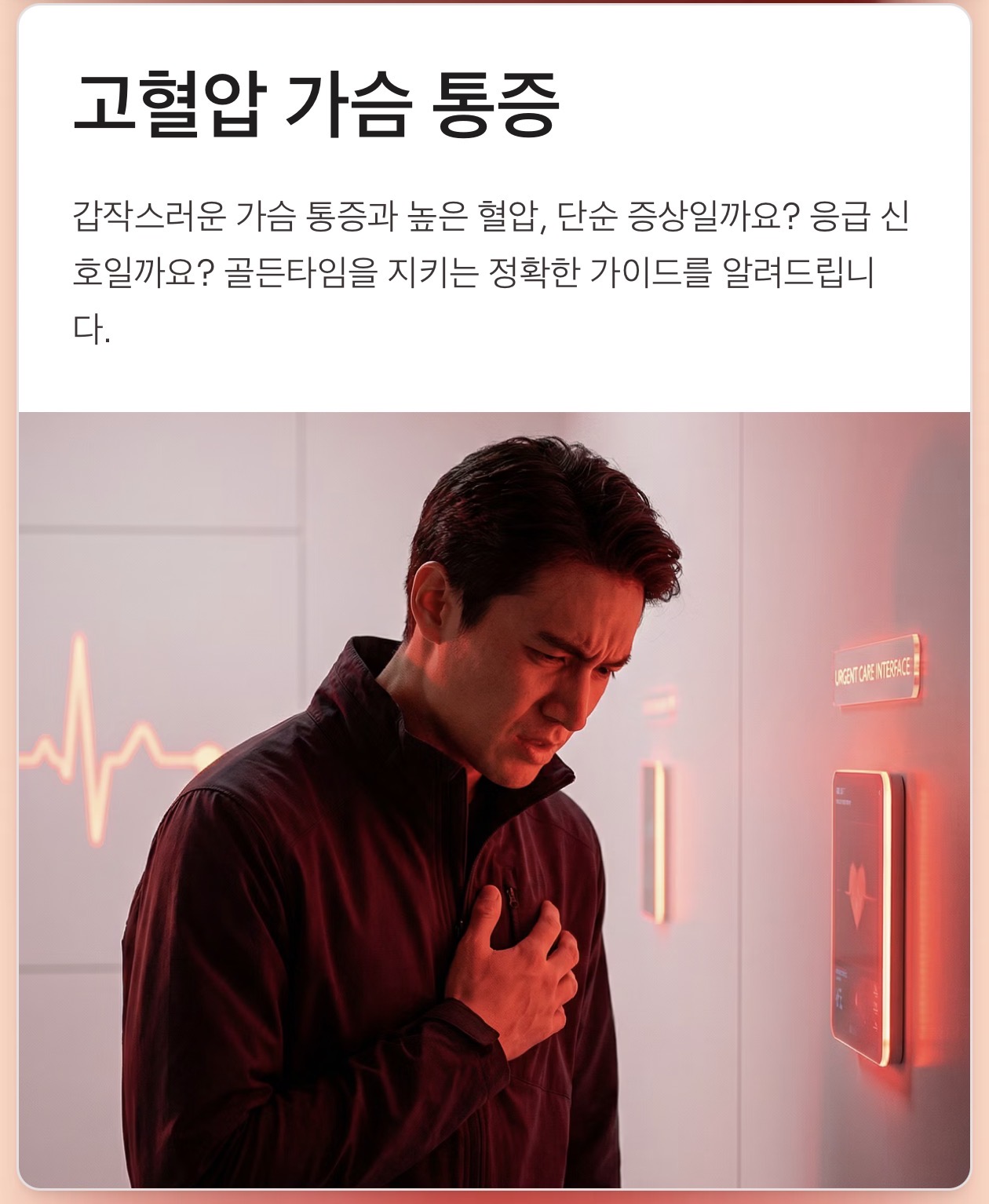 갑자기 가슴이 쪼이는 듯한 통증이 느껴질 때, 혈압까지 높게 측정되면 누구나 당황하기 마련입니다. "조금 쉬면 괜찮겠지" 하며 침대에 눕고 싶으신가요?